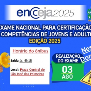 ENCCEJA - 2025: ATENÇÃO SÃOJOSÉLIENSES INSCRITOS! FIQUEM ATENTOS PARA O LOCAL E O HORÁRIO DE SAÍDA DO TRANSPORTE PARA A REALIZAÇÃO DO EXAME (DIA 03 DE AGOSTO )