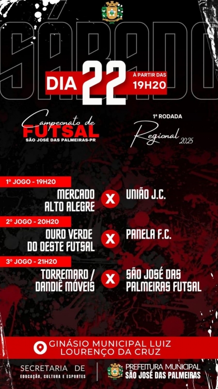 No sábado (22), a Prefeitura de São José das Palmeiras, por meio da Secretaria de Educação, Cultura e Esportes através do Departamento de Esportes realizará no Ginásio de Esportes - Luiz Lourenço da Cruz, a abertura da 13ª edição do Campeonato Regional de Futsal.