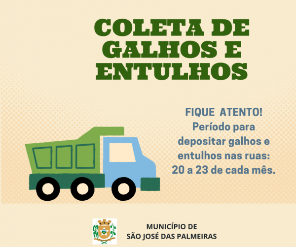 A Secretaria de Obras, Urbanismo e Transportes de São José das Palmeiras, alerta a população, que o período para depositar galhos e entulhos nas ruas, será do dia 20 a 23 de cada mês.
