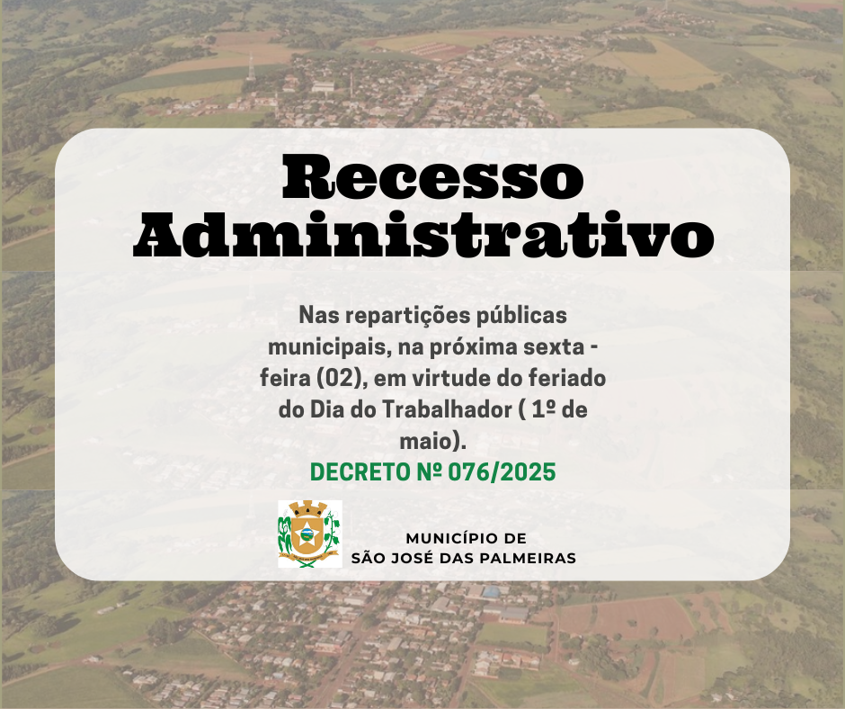 Em virtude do feriado do Dia do Trabalhador, comemorado no dia 1º de maio, a Prefeitura de São José das Palmeiras, decretou recesso administrativo nas repartições públicas municipais, no próximo dia 02 (sexta-feira); sem interrupções nos serviços essenciais.