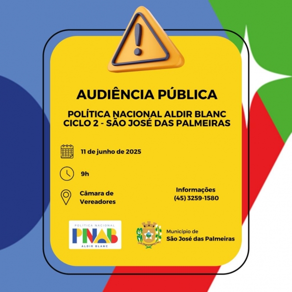 A Administração de São José das Palmeiras junto ao Conselho Municipal de Política Cultural (СМPС), convida os artistas locais e demais membros da comunidade sãojoséliense, para Audiência Pública referente à Lei Federal nº 14.399, de 8 de julho de 2022, que institui a Política Nacional Aldir Blanc de Fomento à Cultura (PNAB) - Ciclo 2.