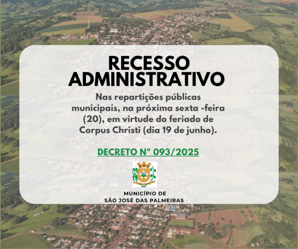 Devido ao feriado nacional  de Corpus Christi, celebrado na próxima quinta-feira (19),  a Prefeitura de São José das Palmeiras decretou recesso administrativo nas repartições públicas municipais, na próxima sexta-feira (20); sem interrupções nos serviços essenciais.