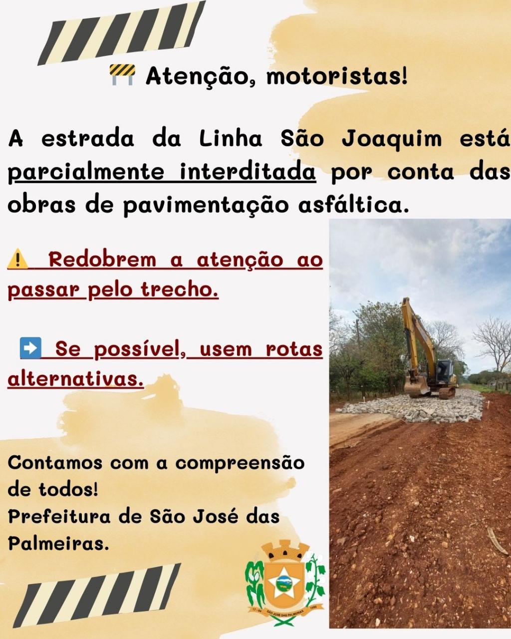 LINHA SÃO JOAQUIM/PAVIMENTAÇÃO ASFÁLTICA: ATENÇÃO MOTORISTAS PARA ESTRADA PARCIALMENTE INTERDITADA