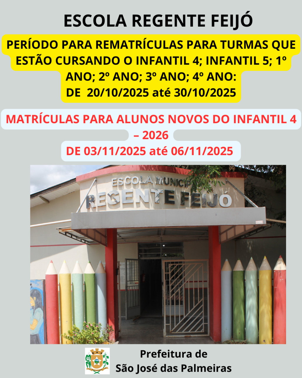 A Secretaria de Educação de São José das Palmeiras informa aos pais e/ou responsáveis sobre o cronograma de rematrículas e matrículas para o ano letivo de 2026, para a Escola Municipal Regente Feijó.